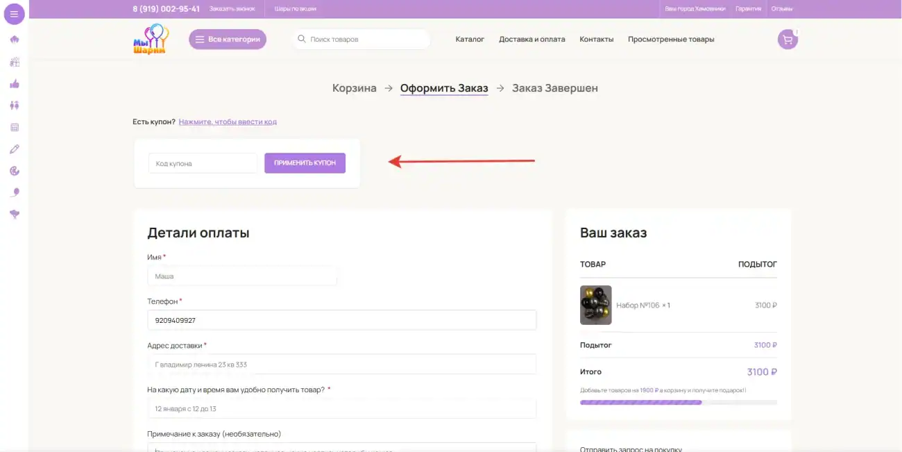- Заполните контактные данные и адрес доставки
